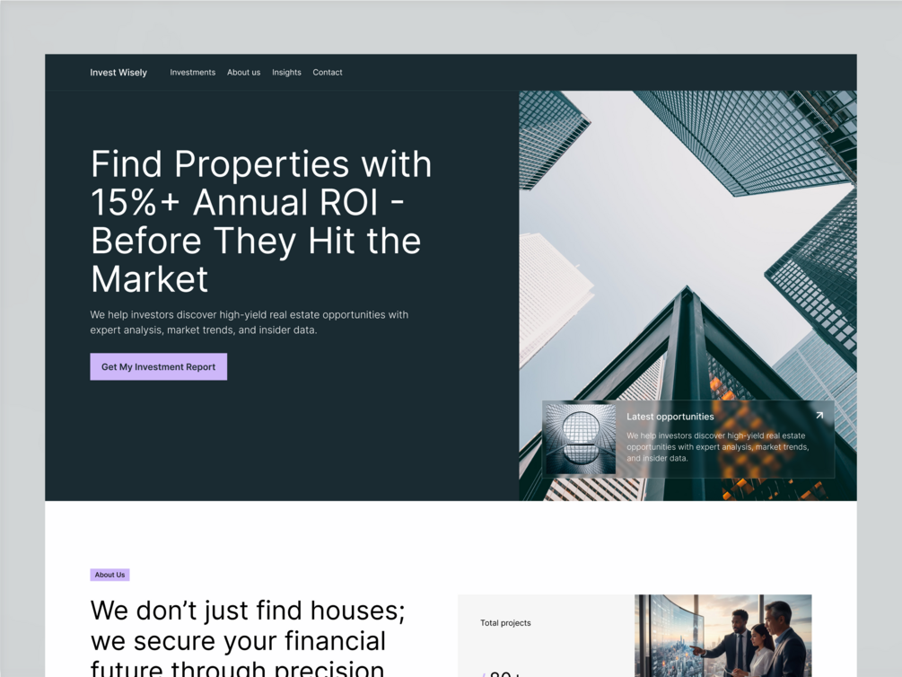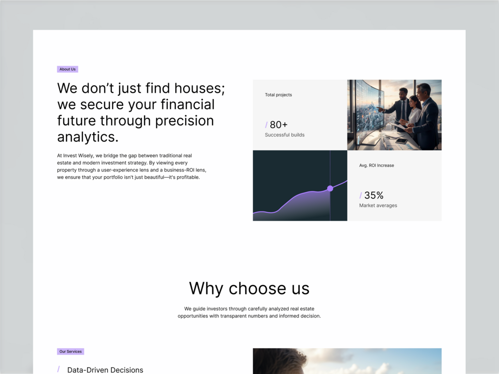 - Data-Forward Sections: Custom modules for displaying market averages, project counts, and ROI increase percentages to emphasize precision analytics.
